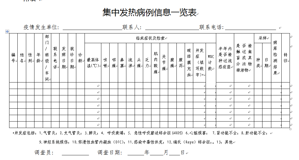 辖区疾控中心应通过查阅晨午检记录、缺勤记录或就诊记录等进行病例搜索,根据“集中发热病例调查一览表”(附表4)和“流感重症和死亡病例个案调查表”(附表5),对报告或发现的病例及时进行流行病学调查,调查内容包括: