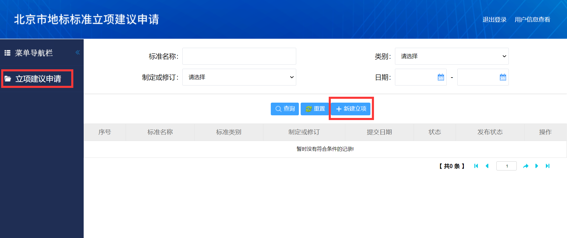 3、进入{立项建议申请}菜单,点击【新建立项】按钮(图1-4),在新建立项页面填写信息,单击【保存】按钮(图1-5)完成信息录入。