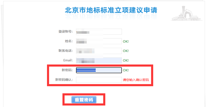注3:忘记密码时,在登录页面点击【忘记密码】按钮(图1-10)进入密码重置页面(图1-11),输入用户信息后点击【确认】按钮,若用户信息正确则弹出新密码和新密码确认,请输入新密码后【重置密码】按钮(图1-12),完成重置密码操作。