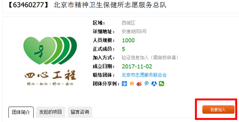 (2)志愿团体名称请设置为“北京市精神卫生保健所志愿服务**区分队”(例如:北京市精神卫生保健所志愿服务东城区分队)。
