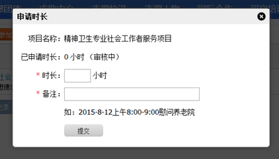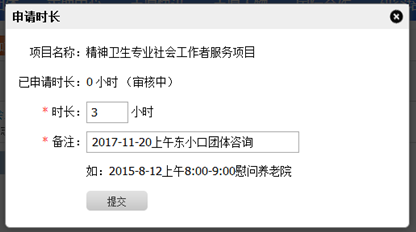 2.指导心理服务志愿者参与社区心理健康宣传与教育工作时,积极申报“心理健康‘四进’行动 ”项目,并根据个人参与工作的实际情况填写志愿服务信息。其中,服务时长按工作实际情况填写,备注按照“服务时间+具体时间+区+活动地点+四进类型/大讲堂”进行填写(例如:20180301,上午08:00-09:00,东城区东华门街道,进社区活动)。