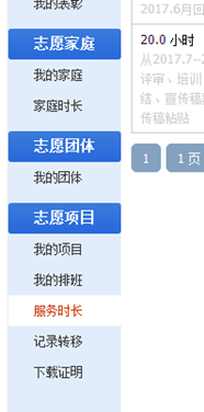 (1)在页面左侧选择“用户中心”—“志愿项目”—“服务时长”(见下图),页面右侧即显示自己的服务时长。