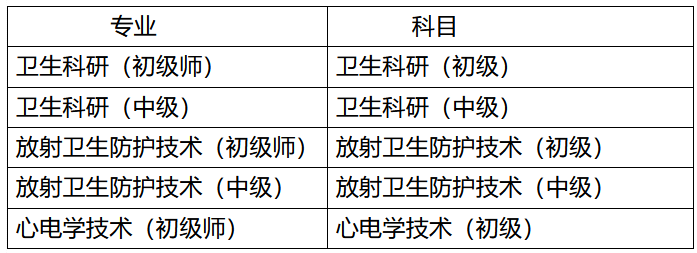 2.本年度未列入全国统考专业初、中级卫生专业技术资格考试、评审工作共设置卫生科研(初级师、中级)、放射卫生防护技术(初级师、中级)、心电学技术(初级师)三个专业,各级别均参加1门专业科目考试。考生通过专业科目考试在连续的2个考试年度内经评审通过即取得相应专业技术资格。各专业技术资格考试科目如下: