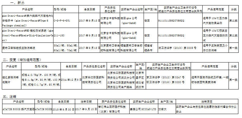 2017年9月北京市消毒产品卫生安全评价报告备案公示
