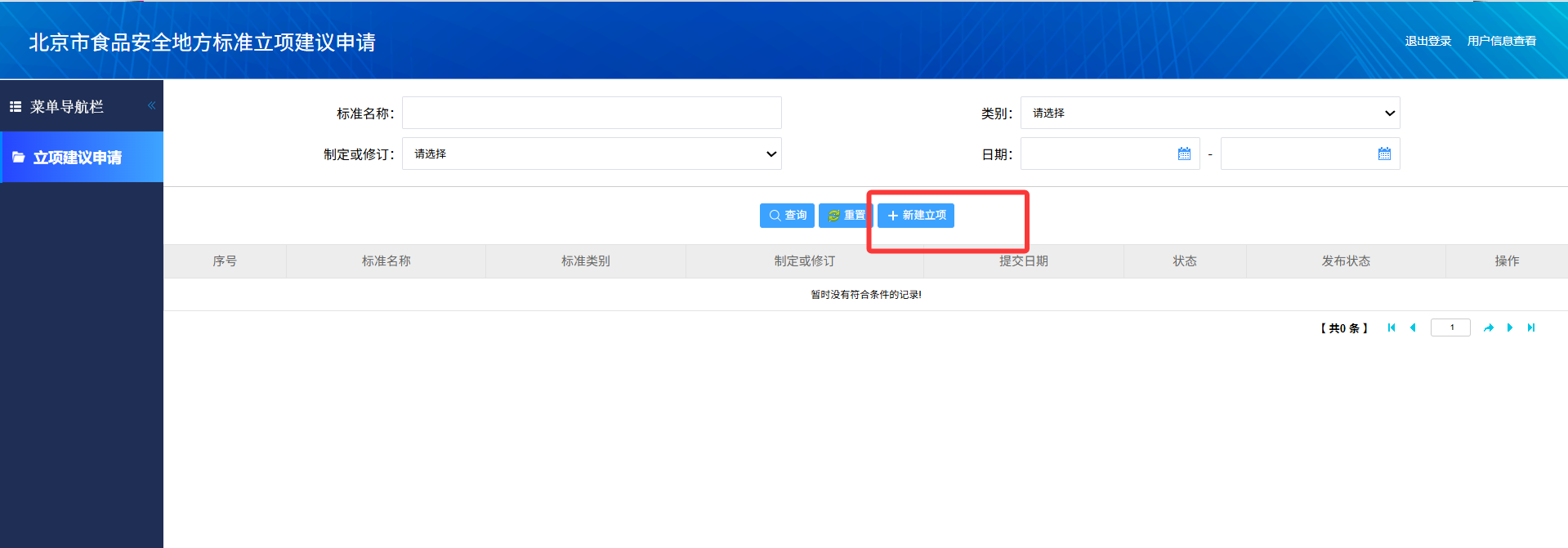 3、进入{立项建议申请}菜单,点击【新建立项】按钮(图1-4),在新建立项页面填写信息,单击【保存】按钮(图1-5)完成信息录入。