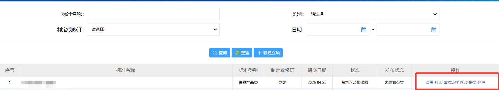 4、保存成功后返回{立项建议申请}主页面,点击【提交】按钮完成地方标准立项申请。根据使用需要可以进行查看信息、打印、审核流程(查看审核结果)、修改(请注意信息[状态],若审核不通过会被退回请您及时修改)、删除(已提交信息不建议删除)等操作(图1-6)。